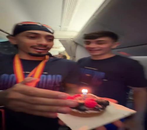 赛后巴萨球员们乘坐返程飞机,队友们为年轻小将德罗准备了惊喜生日蛋糕,共同唱起生日快乐歌,为他庆祝18岁生日。巴萨官方社交媒体晒出这段温馨视频,小将德罗露出笑容,现场充满欢乐与团结的氛围。