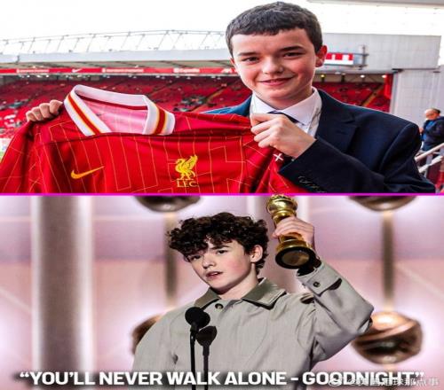 利物浦球迷欧文·库珀在金球奖获奖感言环节用队歌“你永远不会独行”结尾❤️